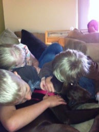 Thank you Just an update: buddy is sleeping inside with the boys in crate but also likes their beds. No accidents or issues. He goes on morning walks, plays fetch, stays on his blanket in the living room when told, loves car rides. He did jump in our pool and then got a bath which he sat perfect for. We found his special spot for scratching his belly -lays on his back with his paws up. He is very gentle and loving. We are enjoying him so much. You and Ron did a great job training him to be such a great dog. We are so happy he is part of our family. Thank you