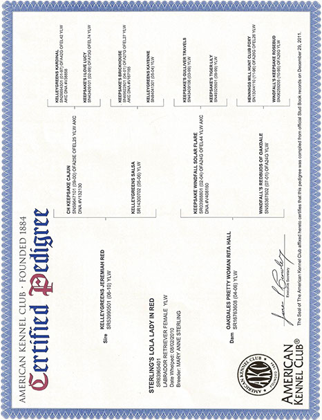 Little Lola is a very sweet and loving fox red female with lots of great fox red blood lines from Kelley Green Labradors, Hennings Mill and Champion Caption Red. Little Lola was named by our baby Jada who at the time had very limited speech and one of the few words she could say was Lola. Lola is the pick of her litter and is a slow maturer but gets prettier as she gets older.