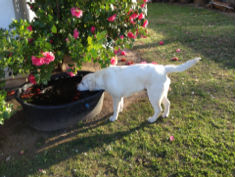 Dear Mary Anne, we love our dog so much. We decided to name him Grady. He was made out of Abby and Newman, and was the liter born on september 10th. He is almost a white color instead of yellow, and he still has a pink nose and pink paws. He is getting very big. He has his mothers legs, ears, tail, black eye liner, and coloring. From his dads side he ended up with his pink nose and paws, rolls of fat, blocky head, and stocky body. I have no clue who this comes from, but he loves to smile. When people walk by they think he is vicious because when he smiles he growls and shows his teeth like he is going to attack. It is pretty funny. He is quite the character. When we go outside he starts going bananas and runs around as fast as he can. Once again thankyou so much for having a wonderful dog for us. He is such a delight. once again thankyou very much, and merry christmas.