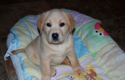 Just wanted to let you know that Sadie our little yellow lab is doing well. We want to thank you for taking her back for a few days while she wasn't feeling so well. We took her to the vet for her 12 week checkup and shots and she has already gained six pounds and is growing quickly. The vet said she is doing good. She is a very smart dog...almost potty trained...can sit on command...and comes when we call her. We love her so much...she has become one of the Pope's. Thank you for providing us with such a good puppy. This picture is at 10 weeks...haven't downloaded our newest ones....but of course she is the most beautiful puppy ever.